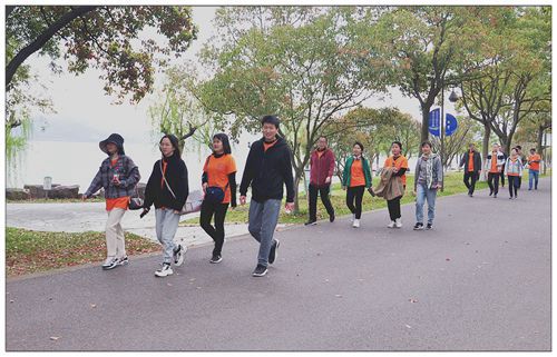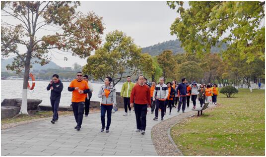 來(lái)到東錢(qián)湖,柳枝搖曳、鮮花盛開(kāi)、碧波蕩漾,令人心曠神怡。陳志勇董事長(cháng)作動(dòng)員發(fā)言,“現在,我們出發(fā)!”一聲響亮的號令,徒步活動(dòng)正式開(kāi)始。從小普陀景區到圓融廣場(chǎng)經(jīng)黃家岙到下水濕地公園,全程大約6公里,一支身著(zhù)橙色衣服的隊伍行走于山水之間,充滿(mǎn)活力與朝氣,形成一道流動(dòng)的風(fēng)景線(xiàn)。