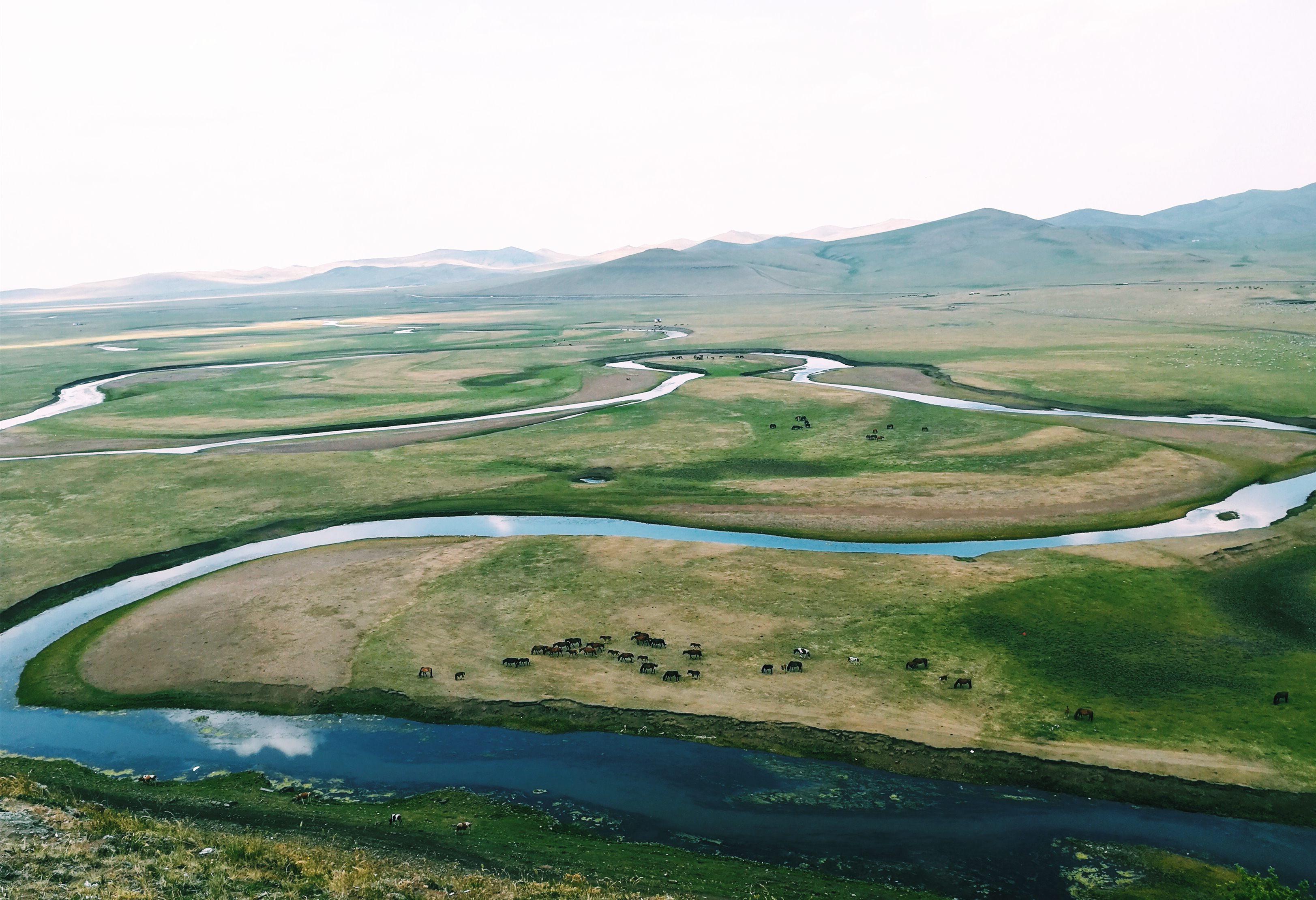 次日,欣賞著(zhù)沿途的風(fēng)景,我們驅車(chē)來(lái)到了老舍筆下的“天下第一曲水”——莫日格勒河。對于見(jiàn)慣大江大河的江南人來(lái)說(shuō),這里的河更像是渠,河道狹窄,彎彎曲曲,潔凈的河水歡快地流淌在草原之上,滋潤著(zhù)河邊的綠植。因為今年是旱季,草原沒(méi)有想象中的翠綠,但絲毫沒(méi)有影響大草原的遼闊和壯美。大家盡情地在草原上撒歡,像是一個(gè)個(gè)大孩子,充分享受著(zhù)粗狂式的自由和灑脫。
